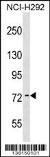 ARHGAP28 Antibody (Center) (Cat. APR15013G) western blot analysis in NCI-H292 cell line lysates (35ug/lane).This demonstrates the ARHGAP28 antibody detected the ARHGAP28 protein (arrow). |