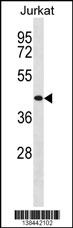 TRHR Antibody (Center) (Cat. AMM08332G) western blot analysis in Jurkat cell line lysates (35ug/lane).This demonstrates the TRHR Antibody detected the TRHR protein (arrow). |