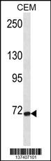 FZD3 Antibody (C-term) (Cat. APR16062G) western blot analysis in CEM cell line lysates (35ug/lane).This demonstrates the FZD3 antibody detected the FZD3 protein (arrow). |