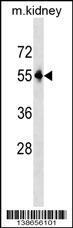 Mouse Pnpla3 Antibody (C-term) (Cat. APR08498G) western blot analysis in mouse kidney tissue lysates (35ug/lane).This demonstrates the Pnpla3 antibody detected the Pnpla3 protein (arrow). |
