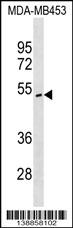 ITPK1 Antibody (N-term) (Cat. APR16946G) western blot analysis in MDA-MB453 cell line lysates (35ug/lane).This demonstrates the ITPK1 antibody detected the ITPK1 protein (arrow). |