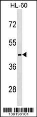 MC5R Antibody (C-term) (Cat. APR12510G) western blot analysis in HL-60 cell line lysates (35ug/lane).This demonstrates the MC5R antibody detected the MC5R protein (arrow). |
