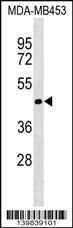 TIMM50 Antibody (N-term) (Cat. APR10449G) western blot analysis in MDA-MB453 cell line lysates (35ug/lane).This demonstrates the TIMM50 antibody detected the TIMM50 protein (arrow). |