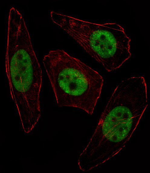 Fluorescent image of U251 cell stained with ULK2 Antibody (Center S323)( AMM08422G).U251 cells were fixed with 4% PFA (20 min), permeabilized with Triton X-100 (0.1%, 10 min), then incubated with ULK2 primary antibody (1:25, 1 h at 37℃). For secondary antibody, Alexa Fluor? 488 conjugated donkey anti-rabbit antibody (green) was used (1:400, 50 min at 37℃).Cytoplasmic actin was counterstained with Alexa Fluor? 555 (red) conjugated Phalloidin (7units/ml, 1 h at 37℃).ULK2 immunoreactivity is localized to Nucleus significantly.