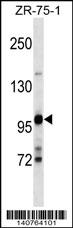 ULK2 Antibody (S323) (Cat. AMM08422G) western blot analysis in ZR-75-1 cell line lysates (35ug/lane).This demonstrates the ULK2 antibody detected the ULK2 protein (arrow). |