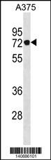 PODN Antibody (C-term) (Cat. AMM07258G) western blot analysis in A375 cell line lysates (35ug/lane).This demonstrates the PODN antibody detected the PODN protein (arrow). |