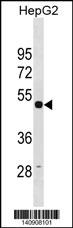 TUBG1 Antibody (N-term) (Cat. AMM08391G) western blot analysis in HepG2 cell line lysates (35ug/lane).This demonstrates the TUBG1 antibody detected the TUBG1 protein (arrow). |