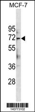ATG13 Antibody (Center S355.) (Cat. APG02022G) western blot analysis in MCF-7 cell line lysates (35ug/lane).This demonstrates the ATG13 antibody detected the ATG13 protein (arrow). |