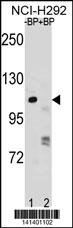 PARP1 Antibody (N-term) (Cat. APR08941G) pre-incubated without(lane 1) and with(lane 2) blocking peptide in NCI-H292 cell line lysate. PARP1 Antibody (N-term) (arrow) was detected using the purified Pab. |