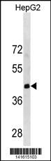 LRRC19 Antibody (C-term) (Cat. APR17240G) western blot analysis in HepG2 cell line lysates (35ug/lane).This demonstrates the LRRC19 antibody detected the LRRC19 protein (arrow). |