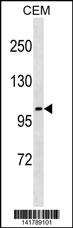 UNC5C Antibody (N-term) (Cat. APR13949G) western blot analysis in CEM cell line lysates (35ug/lane).This demonstrates the UNC5C antibody detected the UNC5C protein (arrow). |