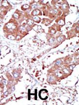 Formalin-fixed and paraffin-embedded human cancer tissue reacted with the primary antibody, which was peroxidase-conjugated to the secondary antibody, followed by DAB staining. This data demonstrates the use of this antibody for immunohistochemistry; clinical relevance has not been evaluated. BC = breast carcinoma; HC = hepatocarcinoma. |