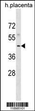 WIPI1 Antibody (N-term) (Cat. APR10751G) western blot analysis in human placenta tissue lysates (35ug/lane).This demonstrates the WIPI1 antibody detected the WIPI1 protein (arrow). |
