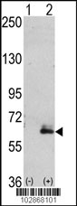 Western blot analysis of hMAP2-Q425 (arrow) using rabbit polyclonal hMAP2-Q425 Antibody (RB02868). 293 cell lysates (2 ug/lane) either nontransfected (Lane 1) or transiently transfected with the hMAP2-Q425 gene (Lane 2) (Origene Technologies).
