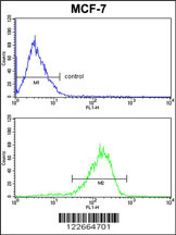 MAP2 Antibody (Cat. APC00064G) FC analysis of MCF-7 cells (bottom histogram) compared to a negative control cell (top histogram). FITC-conjugated goat-anti-rabbit secondary antibodies were used for the analysis. |