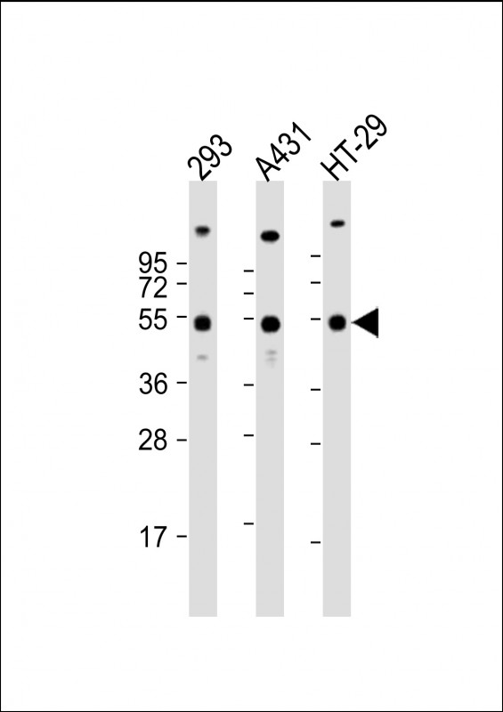 All lanes : Anti-TP53 Antibody (C-term) at 1:2000 dilution Lane 1: 293 whole cell lysate Lane 2: A431 whole cell lysate Lane 3: HT-29 whole cell lysate Lysates/proteins at 20 μg per lane. Secondary Goat Anti-Rabbit IgG, (H+L), Peroxidase conjugated at 1/10000 dilution. Predicted band size : 44 kDa Blocking/Dilution buffer: 5% NFDM/TBST.