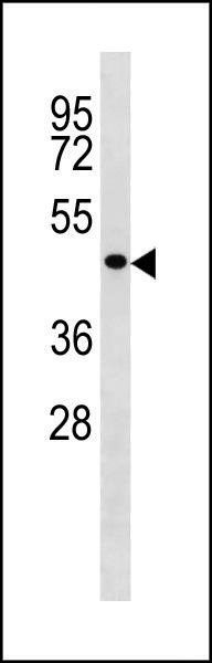TP53 Antibody (C-term) (Cat. APG03008G) western blot analysis in U251 cell line lysates (35ug/lane).This demonstrates the TP53 antibody detected the TP53 protein (arrow). |