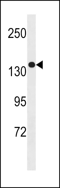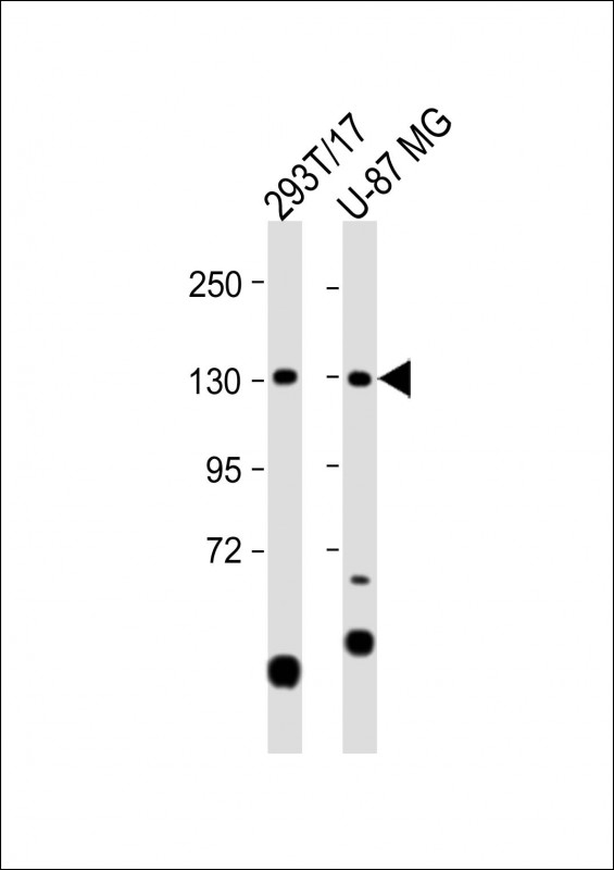 All lanes : Anti-SGSM1 Antibody (Center) at 1:1000 dilution Lane 1: 293T/17 whole cell lysate Lane 2: U-87 MG whole cell lysate Lysates/proteins at 20 μg per lane. Secondary Goat Anti-Rabbit IgG, (H+L), Peroxidase conjugated at 1/10000 dilution. Predicted band size : 130 kDa Blocking/Dilution buffer: 5% NFDM/TBST.