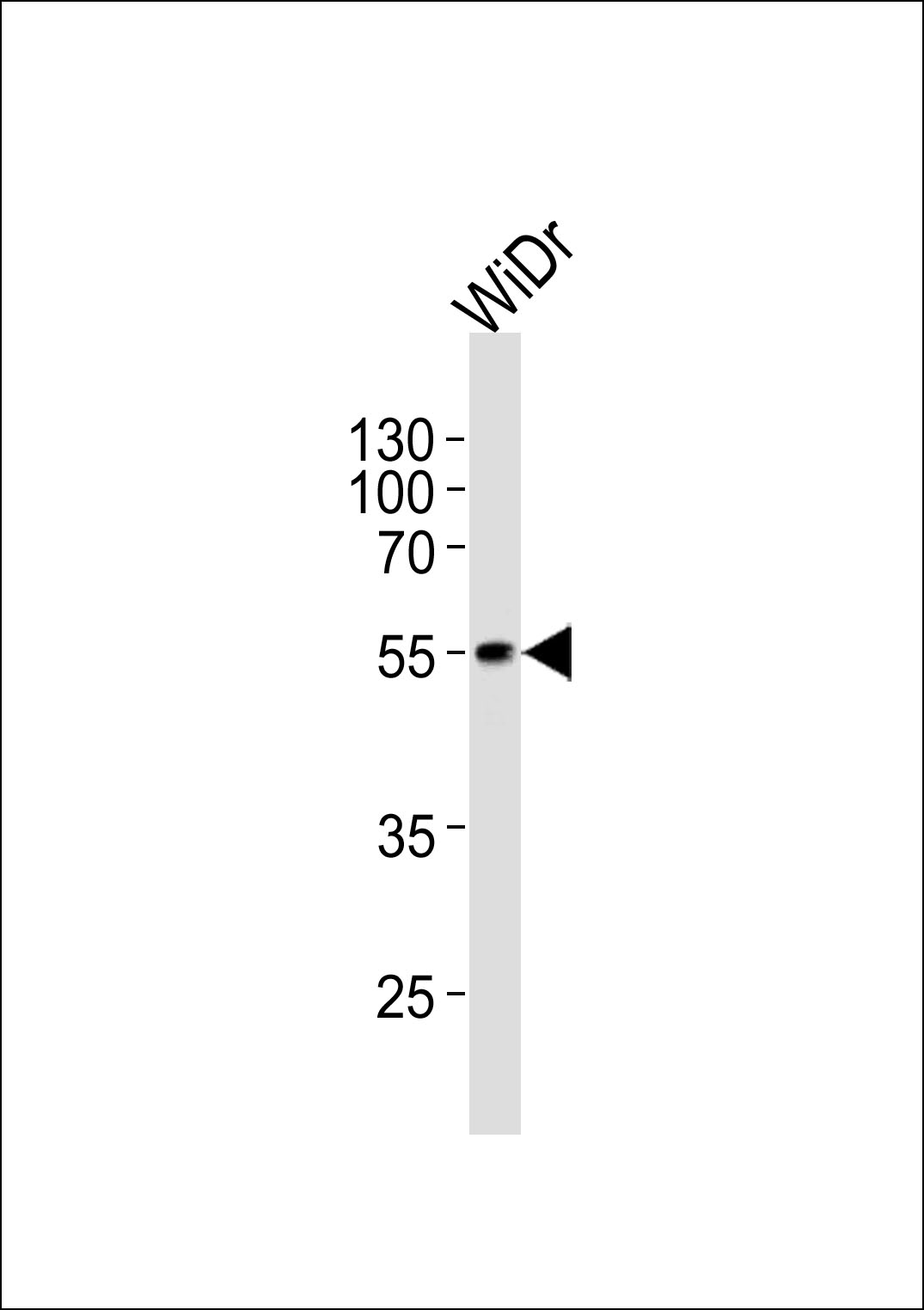 Western blot analysis of lysate from WiDr cell line, using hPDX1R444(Cat. APR09022G). APR09022G was diluted at 1:1000 at each lane. A goat anti-rabbit IgG H&L(HRP) at 1:5000 dilution was used as the secondary antibody. Lysate at 35ug per lane.