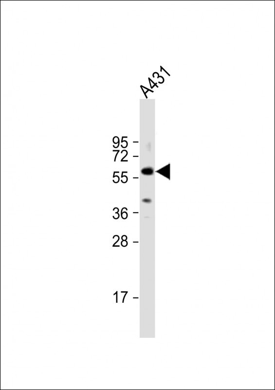 Anti-TGFBR1 Antibody (Center) at 1:2000 dilution + A431 whole cell lysate Lysates/proteins at 20 μg per lane. Secondary Goat Anti-Rabbit IgG, (H+L), Peroxidase conjugated at 1/10000 dilution. Predicted band size : 56 kDa Blocking/Dilution buffer: 5% NFDM/TBST.