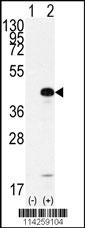 Western blot analysis of SOX2 (arrow) using rabbit polyclonal SOX2 Antibody (C265) (Cat. APR13489G). 293 cell lysates (2 ug/lane) either nontransfected (Lane 1) or transiently transfected with the SOX2 gene (Lane 2) (Origene Technologies). |