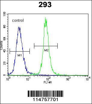 SOX2 Antibody (Cat. APR13481G) flow cytometric analysis of 293 cells (right histogram) compared to a negative control cell (left histogram).FITC-conjugated goat-anti-rabbit secondary antibodies were used for the analysis. |