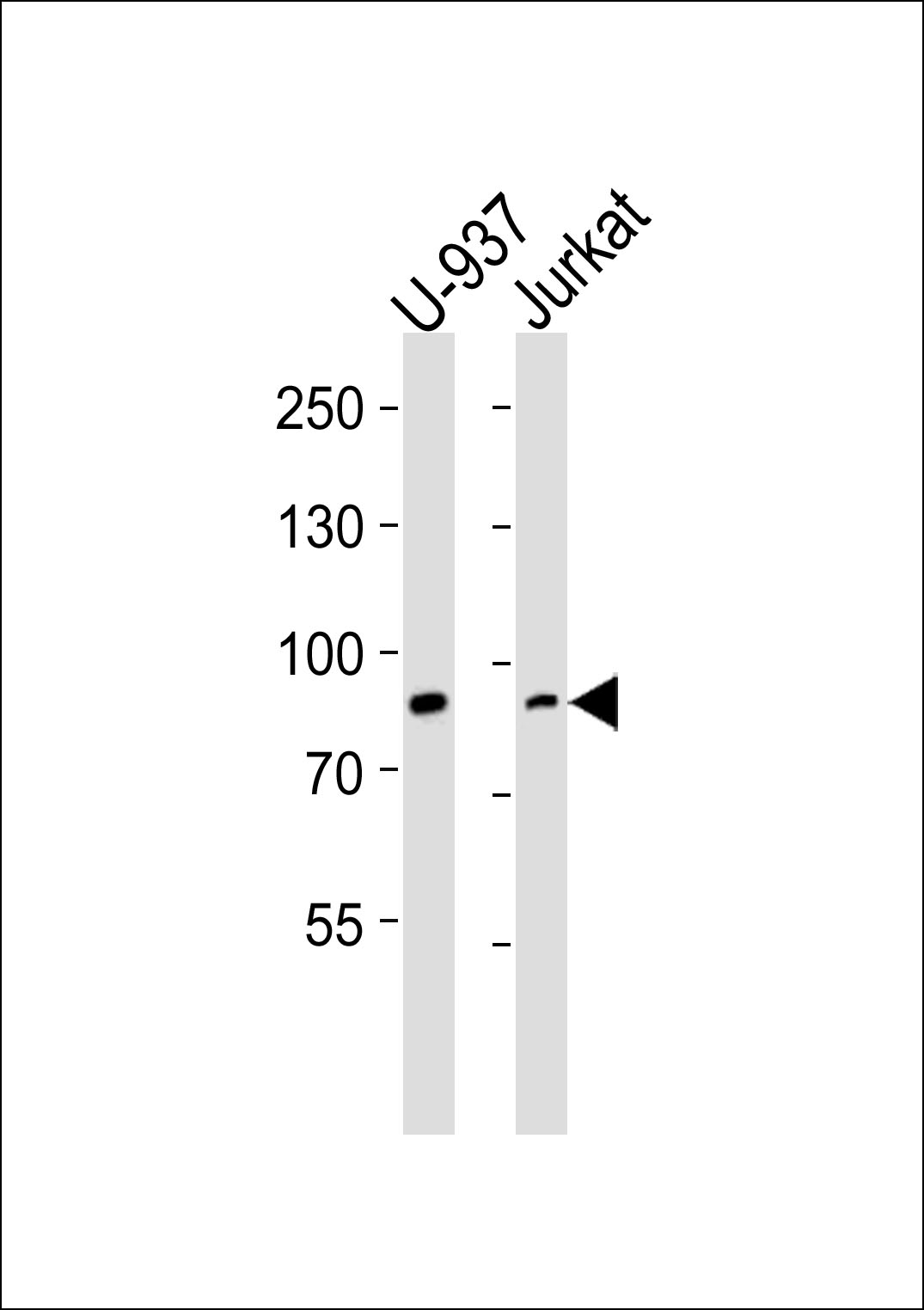 Western blot analysis of lysates from U-937, Jurkat cell line (from left to right), using PIK3R1/2 Antibody (Center)( APR09280G). APR09280G was diluted at 1:1000 at each lane. A goat anti-rabbit IgG H&L(HRP) at 1:5000 dilution was used as the secondary antibody. Lysates at 35ug per lane. |