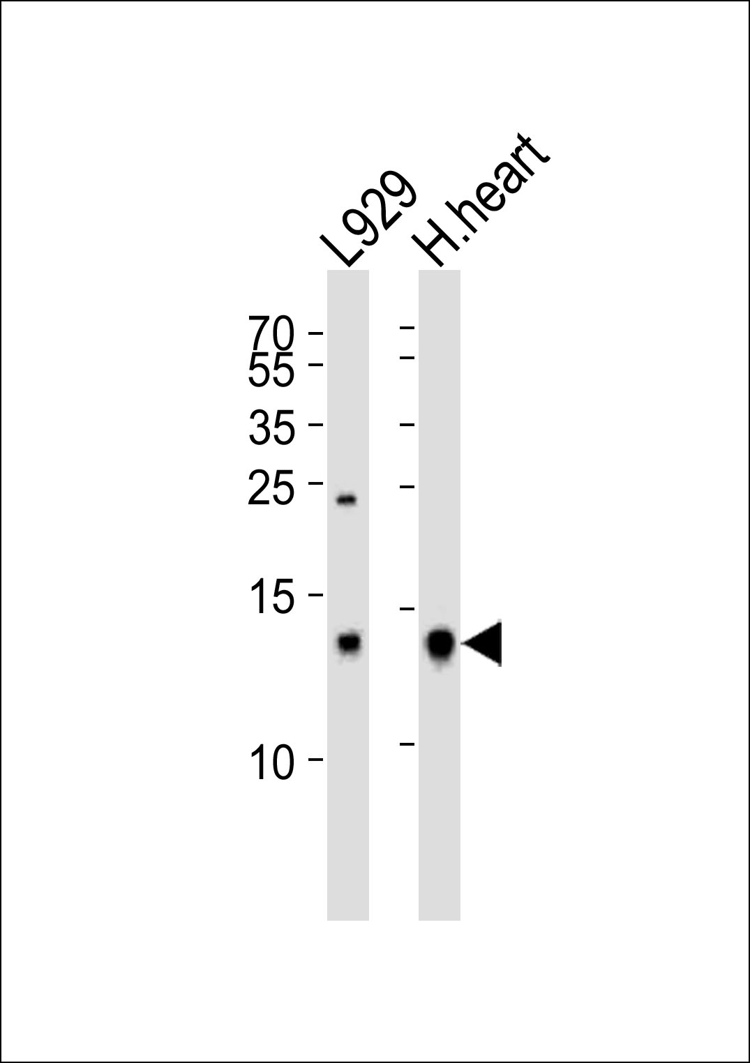 Western blot analysis of lysates from L929 cell line and human heart tissue lysate(from left to right), using CYCS Antibody (Center)( APG02864G). APG02864G was diluted at 1:1000 at each lane. A goat anti-rabbit IgG H&L(HRP) at 1:5000 dilution was used as the secondary antibody. Lysates at 35ug per lane. |