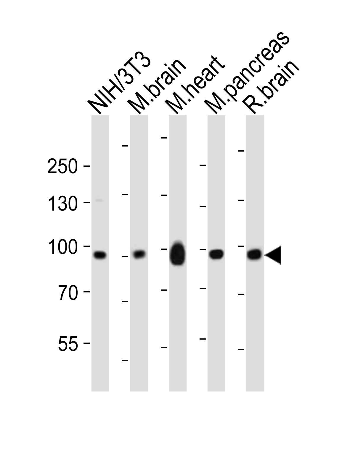 Western blot analysis of lysates from mouse NIH/3T3 cell line, mouse brain, mouse heart, mouse pancreas, rat brain tissue (from left to right), using Ephb1 Antibody (Center)( AMM06435G). AMM06435G was diluted at 1:1000 at each lane. A goat anti-rabbit IgG H&L(HRP) at 1:10000 dilution was used as the secondary antibody. Lysates at 20ug per lane. |