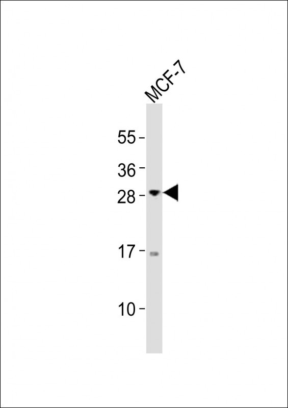 Anti-OLIG3 Antibody (Center)at 1:2000 dilution + MCF-7 whole cell lysates Lysates/proteins at 20 μg per lane. Secondary Goat Anti-Rabbit IgG, (H+L), Peroxidase conjugated at 1/10000 dilution Predicted band size : 29 kDa Blocking/Dilution buffer: 5% NFDM/TBST.