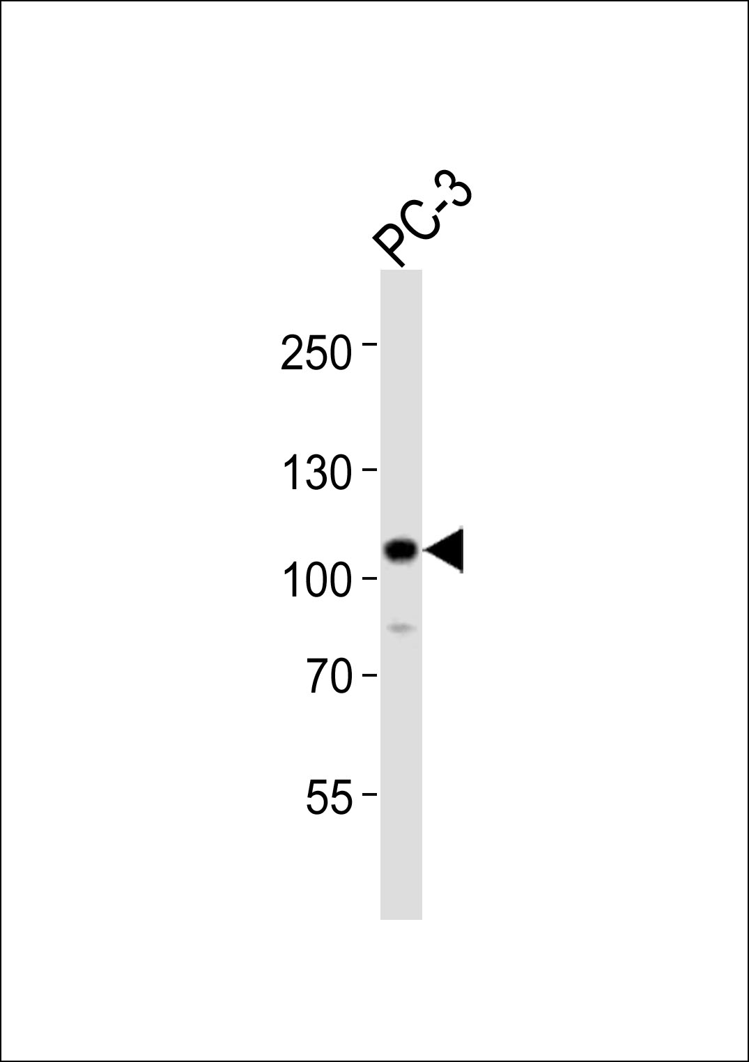 Western blot analysis of lysate from PC-3 cell line, using Mouse Ephb4 Antibody (C-term)( AMM06437G). AMM06437G was diluted at 1:1000. A goat anti-rabbit IgG H&L(HRP) at 1:10000 dilution was used as the secondary antibody. Lysate at 20ug. |