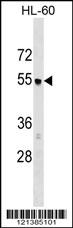 AP3M1 Antibody (C-term) (Cat. APR14975G) western blot analysis in HL-60 cell line lysates (35ug/lane).This demonstrates the AP3M1 antibody detected the AP3M1 protein (arrow). |