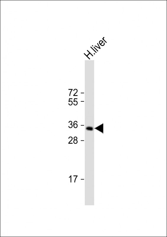 Anti-GNMT Antibody (Center) at 1:1000 dilution + human liver lysate Lysates/proteins at 20 μg per lane. Secondary Goat Anti-Rabbit IgG, (H+L), Peroxidase conjugated at 1/10000 dilution. Predicted band size : 33 kDa Blocking/Dilution buffer: 5% NFDM/TBST. |