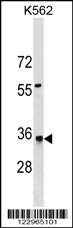 HMGCL Antibody (N-term) (Cat. APR07770G) western blot analysis in K562 cell line lysates (35ug/lane).This demonstrates the HMGCL antibody detected the HMGCL protein (arrow). |