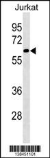 SLU7 Antibody (N-term) (Cat. APR10156G) western blot analysis in Jurkat cell line lysates (35ug/lane).This demonstrates the SLU7 Antibody detected the SLU7 protein (arrow). |