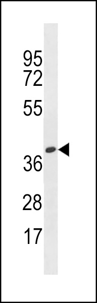 OR4X1 Antibody (N-term) (Cat. APR12575G) western blot analysis in HepG2 cell line lysates (35ug/lane).This demonstrates the OR4X1 antibody detected the OR4X1 protein (arrow). |