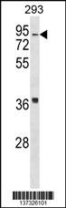 HIRIP3 Antibody (Center) (Cat. APR16639G) western blot analysis in 293 cell line lysates (35ug/lane).This demonstrates the HIRIP3 antibody detected the HIRIP3 protein (arrow). |