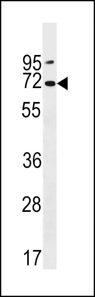 PKD2L2 Antibody (Center) (Cat. AMM07212G) western blot analysis in NCI-H460 cell line lysates (35ug/lane).This demonstrates the PKD2L2 antibody detected the PKD2L2 protein (arrow). |