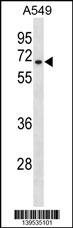 HAS3 Antibody (Center) (Cat. APR12345G) western blot analysis in A549 cell line lysates (35ug/lane).This demonstrates the HAS3 antibody detected the HAS3 protein (arrow). |