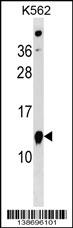 ATPIF1 Antibody (N-term) (Cat. APG02170G) western blot analysis in K562 cell line lysates (35ug/lane).This demonstrates the ATPIF1 antibody detected the ATPIF1 protein (arrow). |