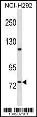 FERMT2 Antibody (C-term) (Cat. APR15947G) western blot analysis in NCI-H292 cell line lysates (35ug/lane).This demonstrates the FERMT2 antibody detected the FERMT2 protein (arrow). |