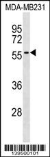 AKAP5 Antibody (Center) (Cat. APR11366G) western blot analysis in MDA-MB231 cell line lysates (35ug/lane).This demonstrates the AKAP5 antibody detected the AKAP5 protein (arrow). |