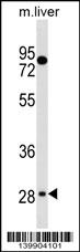 TEF Antibody (C-term) (Cat. AMM08140G) western blot analysis in mouse liver tissue lysates (35ug/lane).This demonstrates the TEF antibody detected the TEF protein (arrow). |