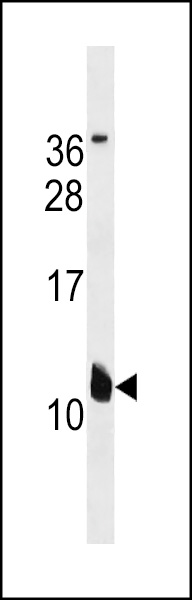KCNE2 Antibody (C-term)(Cat. AMM06088G) western blot analysis in A549 cell line lysates (35ug/lane).This demonstrates the KCNE2 antibody detected the KCNE2 protein (arrow). |