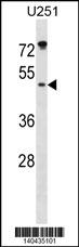 ILKAP Antibody (Center)(Cat. APR16843G) western blot analysis in U251 cell line lysates (35ug/lane).This demonstrates the ILKAP antibody detected the ILKAP protein (arrow). |