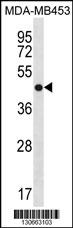 ANXA13 Antibody (N-term) (Cat. APR14949G) western blot analysis in MDA-MB453 cell line lysates (35ug/lane).This demonstrates the ANXA13 antibody detected the ANXA13 protein (arrow). |