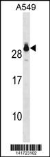 GSTT2 Antibody (Center) (Cat. APR16646G) western blot analysis in A549 cell line lysates (35ug/lane).This demonstrates the GSTT2 antibody detected the GSTT2 protein (arrow). |