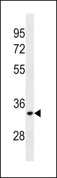 ELOVL3 Antibody (C-term) (Cat. APR07676G) western blot analysis in A2058 cell line lysates (35ug/lane).This demonstrates the ELOVL3 antibody detected the ELOVL3 protein (arrow). |