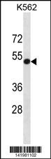 PVR Antibody (C-term) (Cat. AMM05405G) western blot analysis in K562 cell line lysates (35ug/lane).This demonstrates the PVR antibody detected the PVR protein (arrow). |