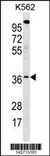 WBSCR22 Antibody (C-term) (Cat. APR10735G) western blot analysis in K562 cell line lysates (35ug/lane).This demonstrates the WBSCR22 antibody detected the WBSCR22 protein (arrow). |